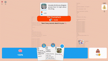 OK JUST SHUT THE LITERAL F- Ok that was a joke, this game is awesome! It has unique mechanics and I have never seen such a interesting concept! Though it is brutal on all the rounds (or that is my bad skills at this game ^_^"). I am looking forward to this shitpost simulator! What I would recommend is a happy face emoji which can produce memes that act as sort of reply baits, or increase your personal up-vote (up arrow) stats, which increase the speed you get your cards!
